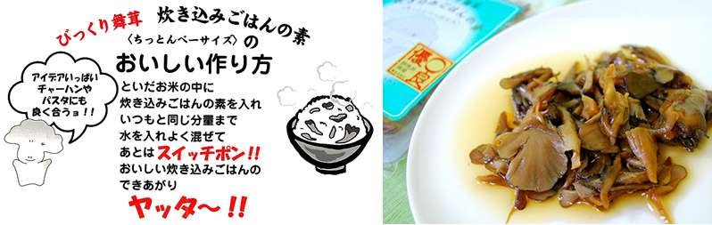 ご家庭でプロの味を!かんたん便利お釜にいれるだけ!! 「ちっとんべーサイズ」は、お一人様向けですので少人数でも食べられます。上質の舞茸を使い、昔なつかしい手作りの味に仕上げました。本物の味覚が、ご家庭でお気軽にお楽しみいただけます。